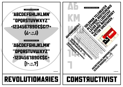 Russian Revolt was created via a regularisation of the modeling of its ‘comrade’ font Cuban Revolt. It is a faux-Russian display face with a range of contextually (Cyrillic) inspired alternate glyphs that reflect the experimental typographies of Dadaism, Suprematism and most importantly Constructivism. An historical experiment that adopts the modernist sans serif letterform genre of the 1920s as being representative of social realisation. Although principally a Latin alphabet, this font reflects a communist typographic idiom that is disappearing from our eastern European cities.
